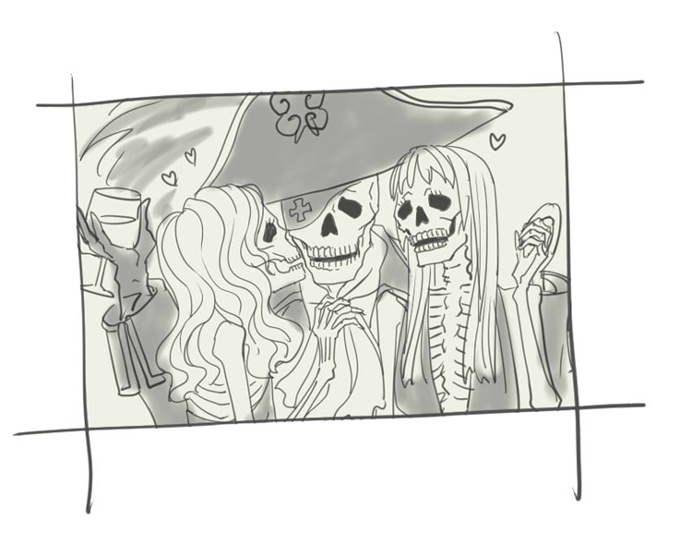 今日のラクガキは1.5次創作あたりでしょうか。 Z/Xの骸骨船長フックのプライベートスナップ描いてみました。 スケルタルセールスさんに女の影を見たので(隣の着物女性は骸骨よね?)、フック船長も何か良い想いして欲しいという気になりまして。 アニメでは彼の乗るボーンシップがチラッと描かれてたのもチェック済みでござる。