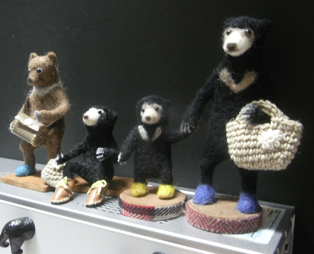 うちのくま家族増えました(笑) この方の作品、ほんとに芸が細かくて、バッグの中にはちゃんとパンやキノコも入ってるんです。