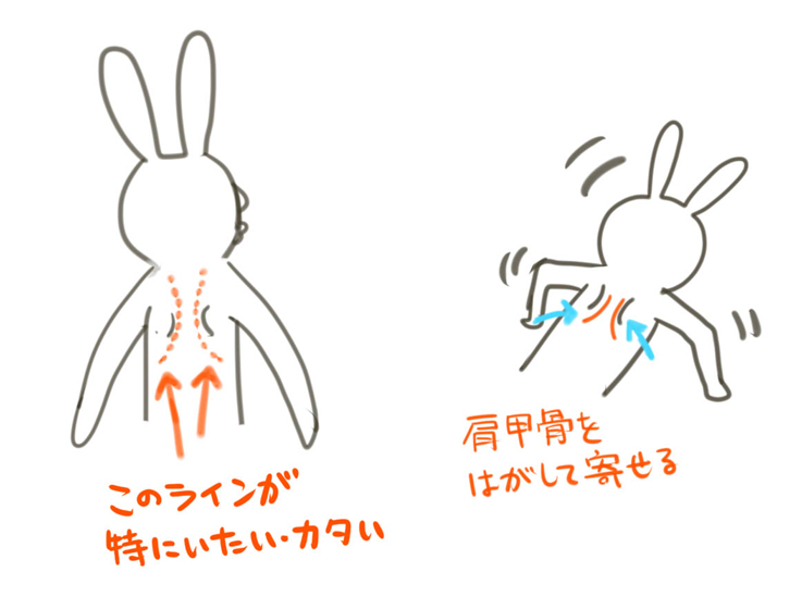 本日の絵図… ここしばらくマッサージ師さんにお世話になって、どのあたりが一番凝ってるかを見て貰った後、こういう体操を考案するに至りました。 肩胛骨を浮かせてぎゅっと寄せる、最初凄く痛かったのだけど、筋肉痛の後、こわばりが取れてきましたよ。