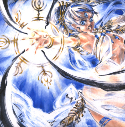 初めてのトレカイラストその2。 この案件頂いた時は嬉しかったな。 何十枚も紙にラフ画を起こして、アクリル絵の具でせっせと描いてました。