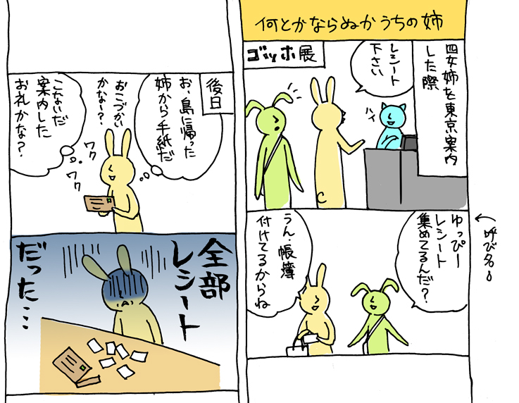 きのう打ち込んだ3か月分の帳簿が消えた…自動バックアップが機能していなかったみたい。 バックアップ方法を増やすしかないのかな。 仕方なくやけ酒をして寝ました。 帳簿を付けてて思い出したことを漫画にしました。 姉〜っ!