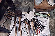 写真上・愛用の工具類。カナヅチ、ヤスリ、ペンチ‥近所の金物屋さんにで売っている物で占める。カーブの利いた鉄面作りに用いる、鉄アレイを両断した手作りの工具なども。
