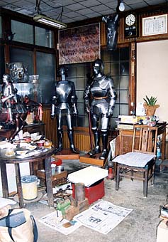 写真下・工房の中。必要な道具と使い込まれた調度品類。写真右上にはPTAの役員任命状と犯人を捕まえたという感謝状が並ぶ。ボンボン時計の左には鉄の馬面。ちょっと見えづらいけど左の青いミニチュア甲冑の入ったガラスケースの上には十字軍時代のバケツの様な形の兜。その手前にはミニチュア版の鎧。右側のテーブルの上には著書「西洋武器甲冑事典」、100円ライターと青ピース、あと、トラノオが一鉢。