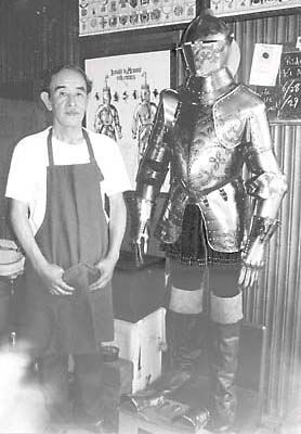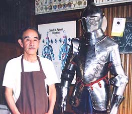 写真上・西洋甲冑作りの腕前は当代随一の三浦權利さん。きさくな方でした。